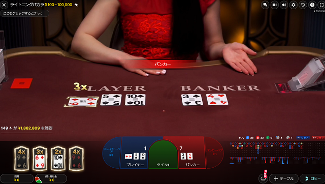 マルチプライヤー付きカードが配布されるEvolutionのライトニングバカラ。勝利時にマルチプライヤーがつくとプレイヤー・バンカーが約500倍、タイは約130万倍まで配当が上がります。一撃を引けたら通常バカラより稼げる余地が高いのでおすすめです!