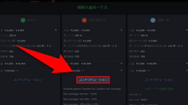 出金条件がベット額に反映される割合はゲーム別に指定されている出金条件消化率によって決まりますが、カジノエックスのゲーム別出金条件消化率は各ボーナスの「コントリビューション」で確認できます。