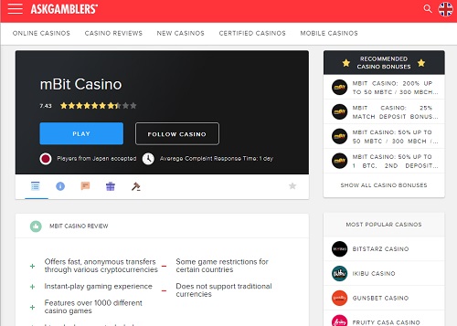 しかし、この検索の仕方だとビットコインが使える他オンラインカジノもヒットしてしまいます。ここではさらに海外オンラインカジノ紹介サイト『ASKGAMBLERS』で検証します。
