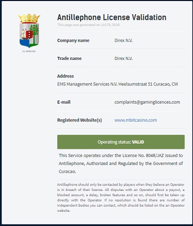 mBitCASINOはキュラソー政府が発行するライセンス(番号:8048/JAZ)のもと、合法的に運営されているオンラインカジノです。
