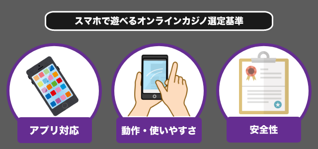 アプリをリリースしているオンラインカジノは少ないですが、スマホ対応しているオンラインカジノは一定数あります。数あるオンラインカジノの中から先に紹介した7サイトを選出するにあたって設けた評価ポイントは下記3項目です。